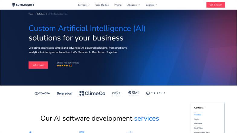 SUMATOSOFT, founded in 2012, delivers AI development solutions, including strategy consulting, system architecture design, product development, and AI integration. Their artificial intelligence software development covers chatbot development, natural language processing, recommendation engines, and machine learning model creation. They offer proof-of-concept and MVP development for validation phases.