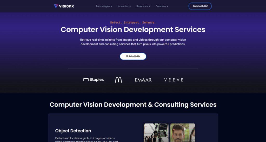 VisionX is a New York-based AI development company founded in 2017, specializing in computer vision solutions for businesses across multiple industries. The company works with modern architectures and frameworks to deliver image classification, facial recognition, and video analysis systems.