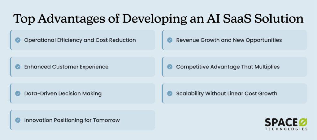 Developing an AI-powered SaaS product unlocks a wide range of advantages that go far beyond traditional software capabilities, helping businesses operate smarter, faster, and more efficiently. Here’s what those results look like and why they’re driving urgent investment across the industry.