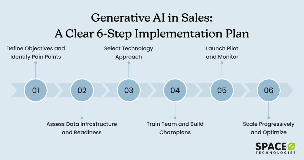 Execution beats technology choice. Each step builds on the previous: clearly define objectives, honestly assess infrastructure, choose the right partner, train your team properly, validate in a controlled pilot, then scale. This transforms generative AI sales solutions from experiments into lasting competitive advantages.