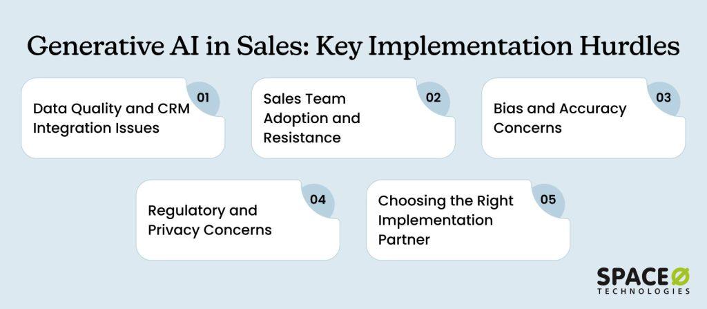 Every organization implementing generative AI for sales encounters consistent obstacles, whether using off-the-shelf platforms or partnering with a generative AI development company for custom solutions. The difference between successful and failed implementations is recognizing these challenges early and planning solutions proactively.