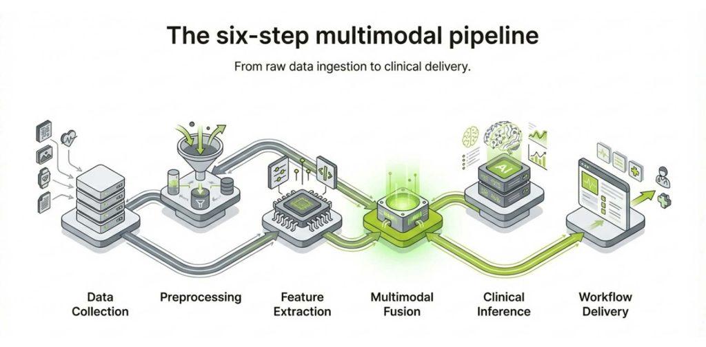 Multimodal AI follows a six-step pipeline from data ingestion to clinical delivery. Here is how each stage works.