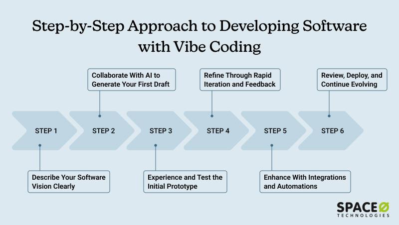This image presents a step-by-step guide to developing software with vibe coding. It highlights six clear stages, from describing your software vision to launching and evolving your application, making the process easy to follow for anyone.